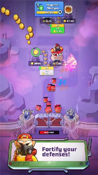 2.随着游戏推进,需要强化防御设施,升级诸如 “Shot-gun” 之类的防御建筑,提升防御能力,应对敌人进攻,遵循 “Fortify your defenses!” 的提示。