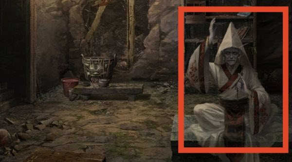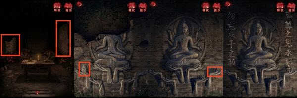 8、前往浊门殿【展开剧情】,点燃蜡烛,查看左侧浮雕,获得线索,查看右侧浮雕,根据左侧六葬菩萨浮雕手中的铜人位置,将「无面铜人」放置在镜像位置(最右侧手中),获得线索(勿忘戌子之耻,葬尊之恩永记)。