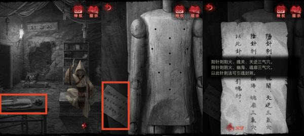32、【民国】前往岐白殿,点击查看木偶,查看木偶身旁的纸条获得线索(阳针:阳火、魄关、天逆;阴针:阴火、幽海、魂扉),将「黑色的针」和「白色的针」放在木偶旁,根据步骤1《岐黄葬草经》中的《仰人全图》和第二页中的文字描述(故用于医术则黑为阳白为阴),分别点击三个「黑色的针」刺在“阳火、魄关、天逆”三穴上;点击三个「白色的针」刺在“阴火、幽海、魂扉”三穴上【展开剧情】,获得「红线」。