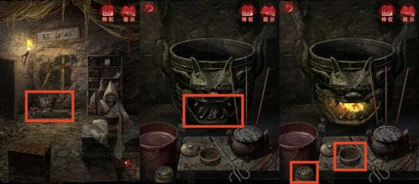 28、【民国】前往岐白殿,点击查看炼丹炉,使用「火镰」点燃木柴,根据步骤1《黄白葬丹经》第二页的文字描述炼制仙药,点击水瓢舀水至炼丹炉,将「干花叶」放入铜碗,加入「阴阳神水」,使用「小锤子」捣碎,点击桌旁装满泥土的陶罐,将泥土包裹石碗,最后送入炉中炼制,触发炼丹小游戏,根据《黄白葬丹经》的描述,使用「火镰」点燃一炷香,当第一炷香烧至红点标记处时点燃第二炷香,当第二炷香烧至红点标记处时点燃第三炷香,当第三炷香刚好烧完的同时,点击“取出铜碗”,获得「熏香」。