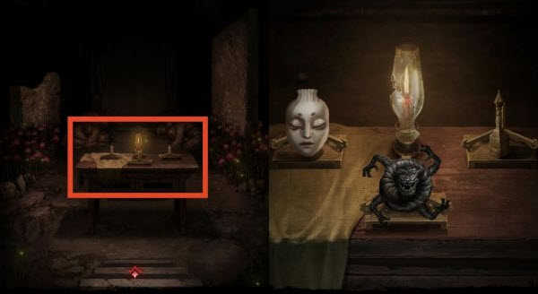 6、进入地道来到浊门殿【展开剧情】,退出浊门场景,查看桌子,使用「火镰」点燃蜡烛,拾取「面具」和「铃铛」。