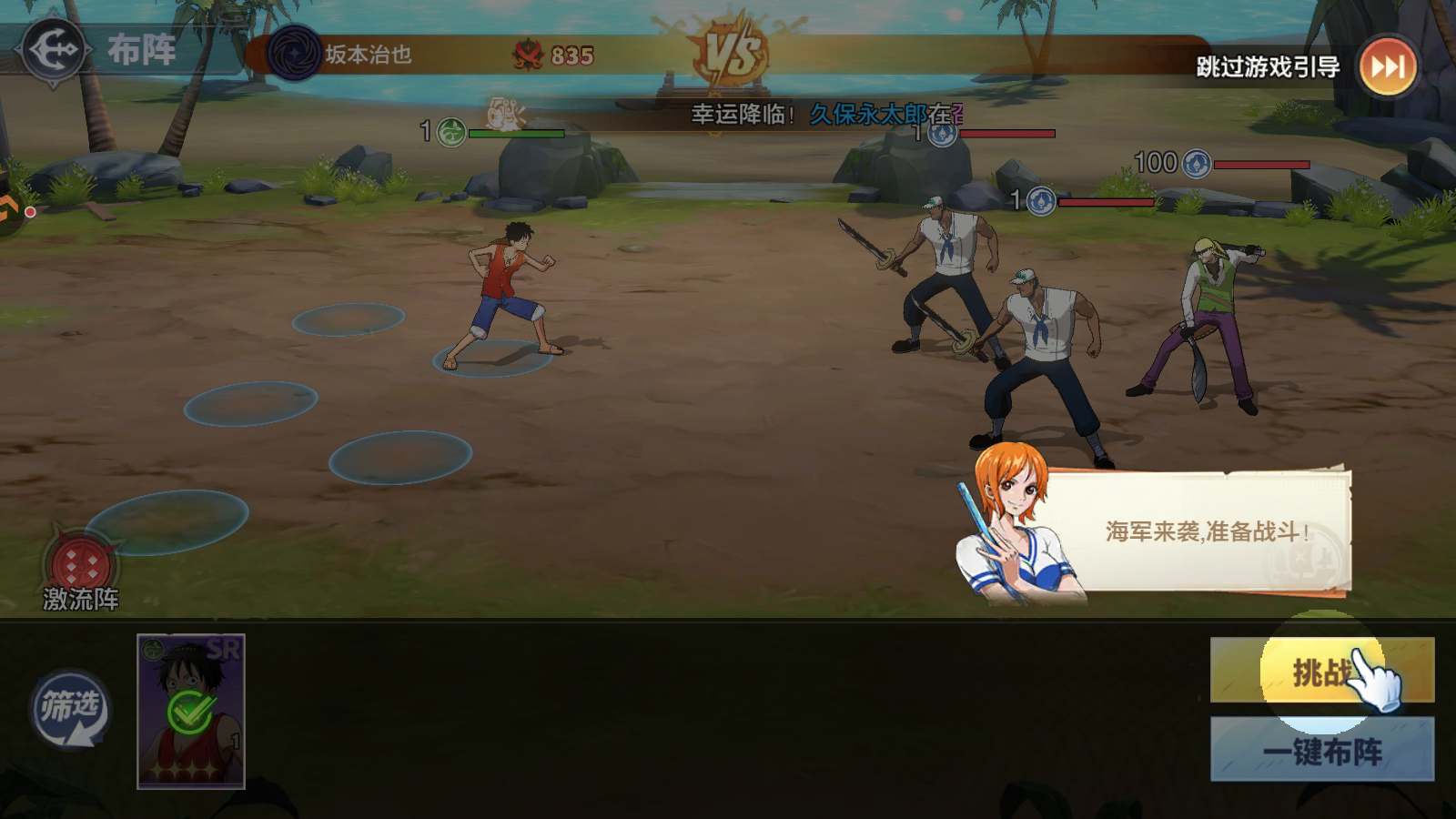 队伍介绍:推荐自由阵营核心角色,新世界乔巴能为队友提供加速buff,汉库克能够沉默敌人并拥有优秀的击杀回复能力,新世界路飞能给敌人施加减速与降低免伤状态。