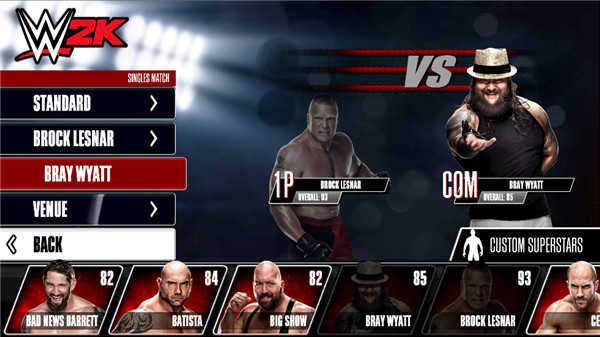 在多种模式中,玩家可根据自身实力进行选择。此外,wwe2k17的操作也非常的简单简单,玩家只需要在屏幕中控制角色的动作,并把控好节奏的和对手动作的预判,就能轻松克制住对手。