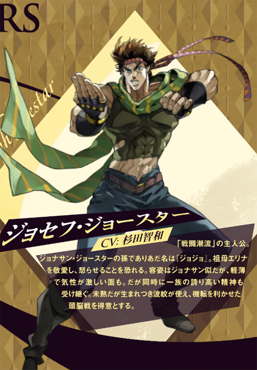 漫画《JOJO的奇妙冒险》系列及其衍生作品中的角色,同时也是第二部《JOJO的奇妙冒险:战斗潮流》的主角。第一代JOJO乔纳森·乔斯达的孙子,是使用波纹气功的天才。