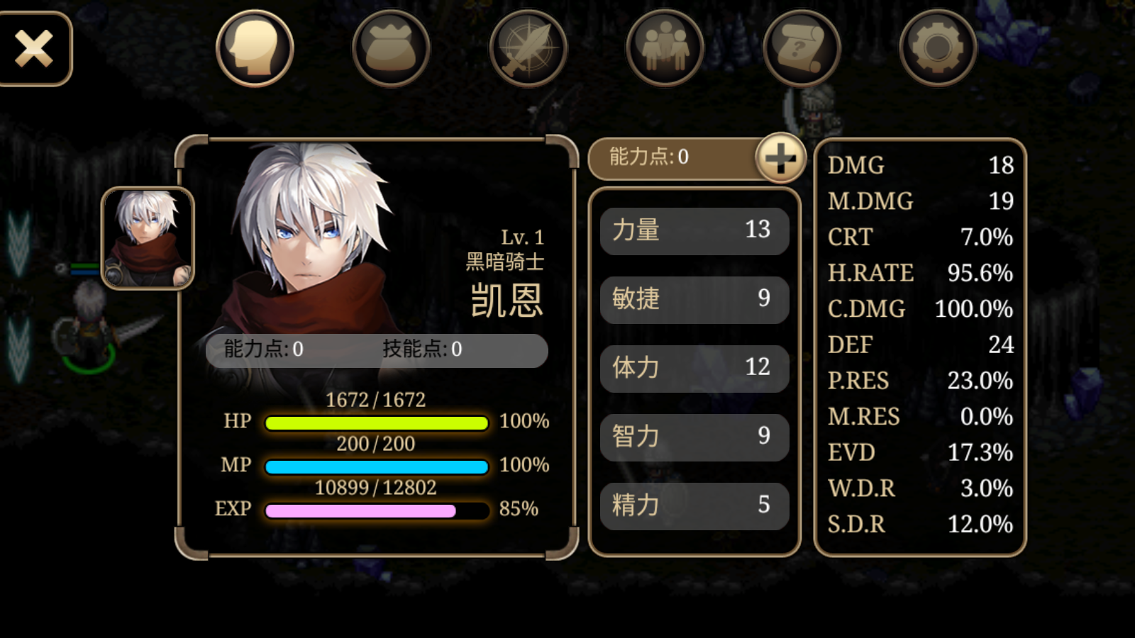 5、点击设置可以查看角色的属性和背包,也可以进行保存,同时游戏中有快捷保存按钮。