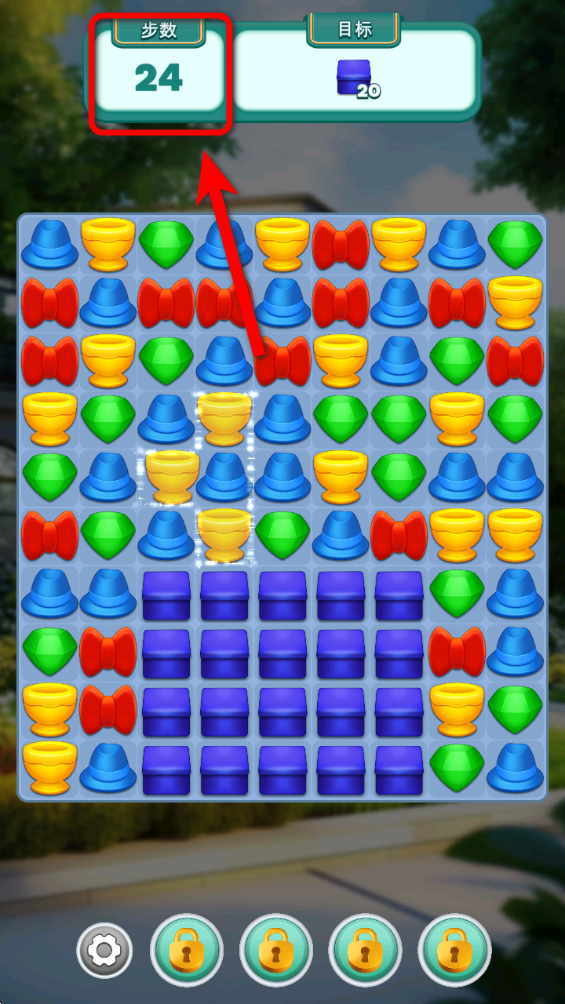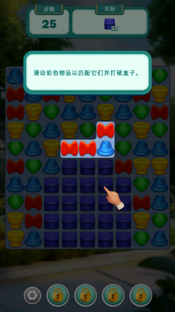 1、移动方块,将三个相同的方块放在一条线上就可以消除。