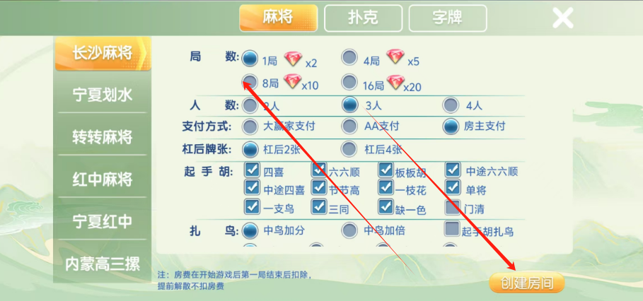 2.进入创建房间页面之后,玩家可以根据自己的需求选择游戏类型、局数、人数、胡牌方式等,点击创建房间即可。