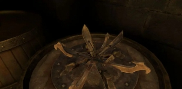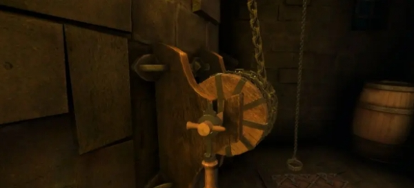 5、回到初始地点会得到勺子,将勺子放入代替铆钉,点击拉动摇把,进入地下室。