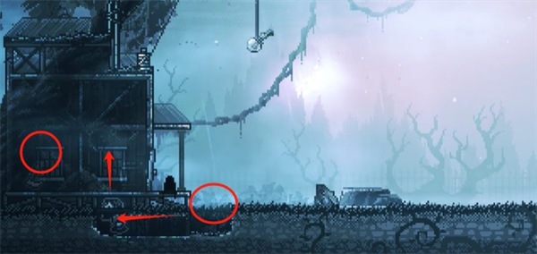 3、流浪者视角。往左走到房子前松动的木板上,站在木板上跳几次,破坏木板,从木板下的坑道爬进房子,获得镰刀。然后推开房门出去,砸死门外的黑色怪物。