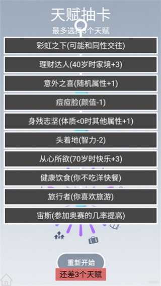 游戏的核心在于天赋选择。每个玩家在开局时将面临众多天赋点的选择。这些天赋涵盖了各种能力和特质,比如智力、魅力、创造力、领导力等。每种天赋都有其独特的技能树,不同的组合会带来不同的成长路径和职业机会。玩家需要根据自己的游戏策略制定最佳的天赋组合,以获取更高的人生得分。