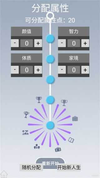 人生规划游戏官方版是一款以模拟真实人生为题材的文字游戏。玩家在游戏中将完整迅速地扮演并体验一个人的一生,从懵懂开端到人生的各个关键阶段,都存在着可能影响未来的关键节点事件。玩家在开局的时候可以选择自己的天赋和属性点分配,从而能够掌控模拟人生的大致走向,每一轮抽取的天赋都不一样,同时一样的天赋和属性分配也可能带来不一样的全新人生轨迹,带给玩家随机但又独特的游戏体验。