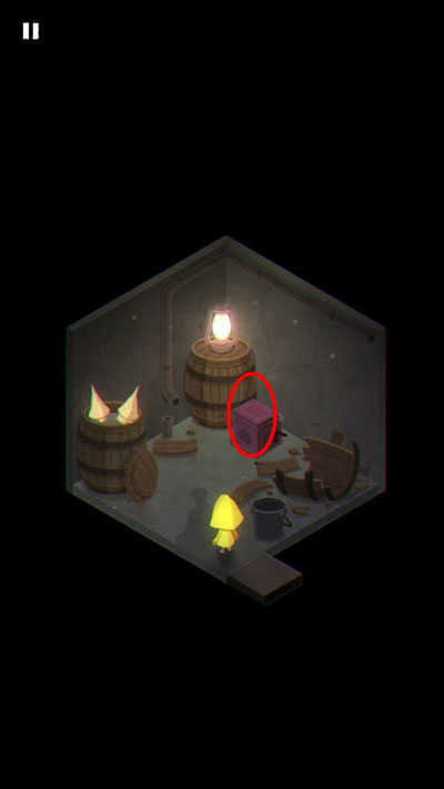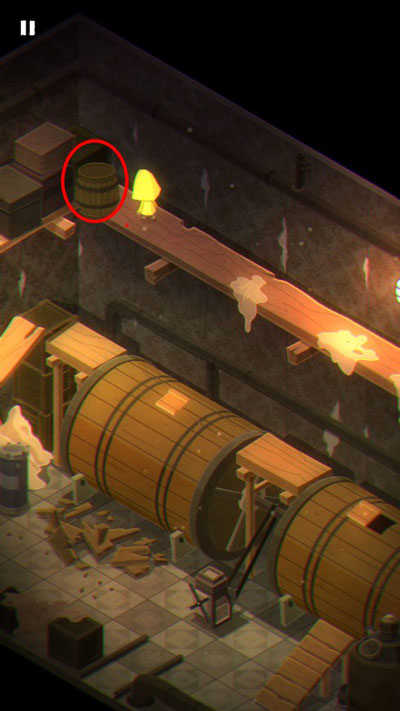 5、从墙壁处往上爬,来到此处将木桶推下去,从墙壁上的小口处来到小房间。