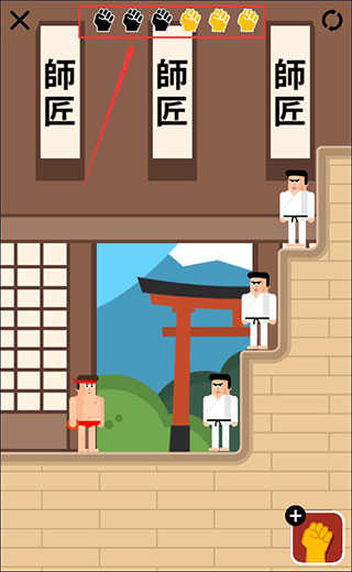 1、进入格斗先生游戏的关卡后,我们可以看到正上方有着6个拳头标识,其中3黑3黄,3个黑色的拳头会影响通关评分,黄色拳头则不会。