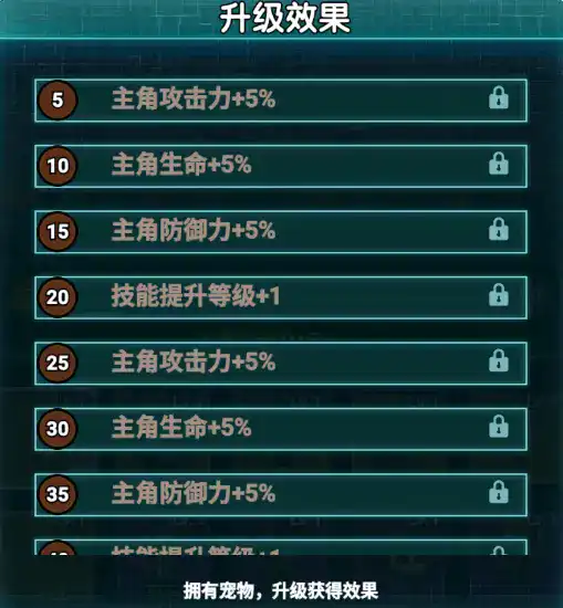 5、每个宠物都有升级效果,升级效果每5级为一个阈值提供的,可以给主角提供永久的属性加成,即使宠物不上阵也是生效的(推荐每个宠物都按5/10/15这样的阈值来进行升级,这样可以均分材料)。