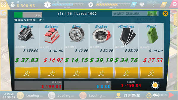 5、点击库房可以将收集到的主要零件进行售卖,比如引擎、轮胎、电池这些,这些零件每隔5秒就会变换一次售价,找最高点时出售。
