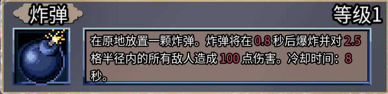 在原地放置一颗炸弹。炸弹将在0.8秒后爆炸并对2.5格半径内的所有敌人造成100点伤害。冷却时间8秒