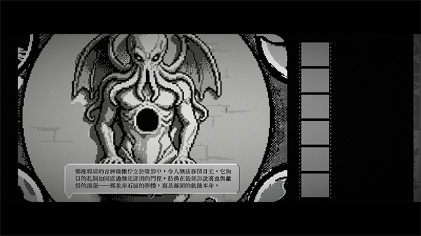 3、直面不可名状: 游戏充满了克苏鲁神话的元素。你将直面形态怪诞的雕像和那些不属于这个世界的“幼崽”,感受它们带来的无声恐惧。
