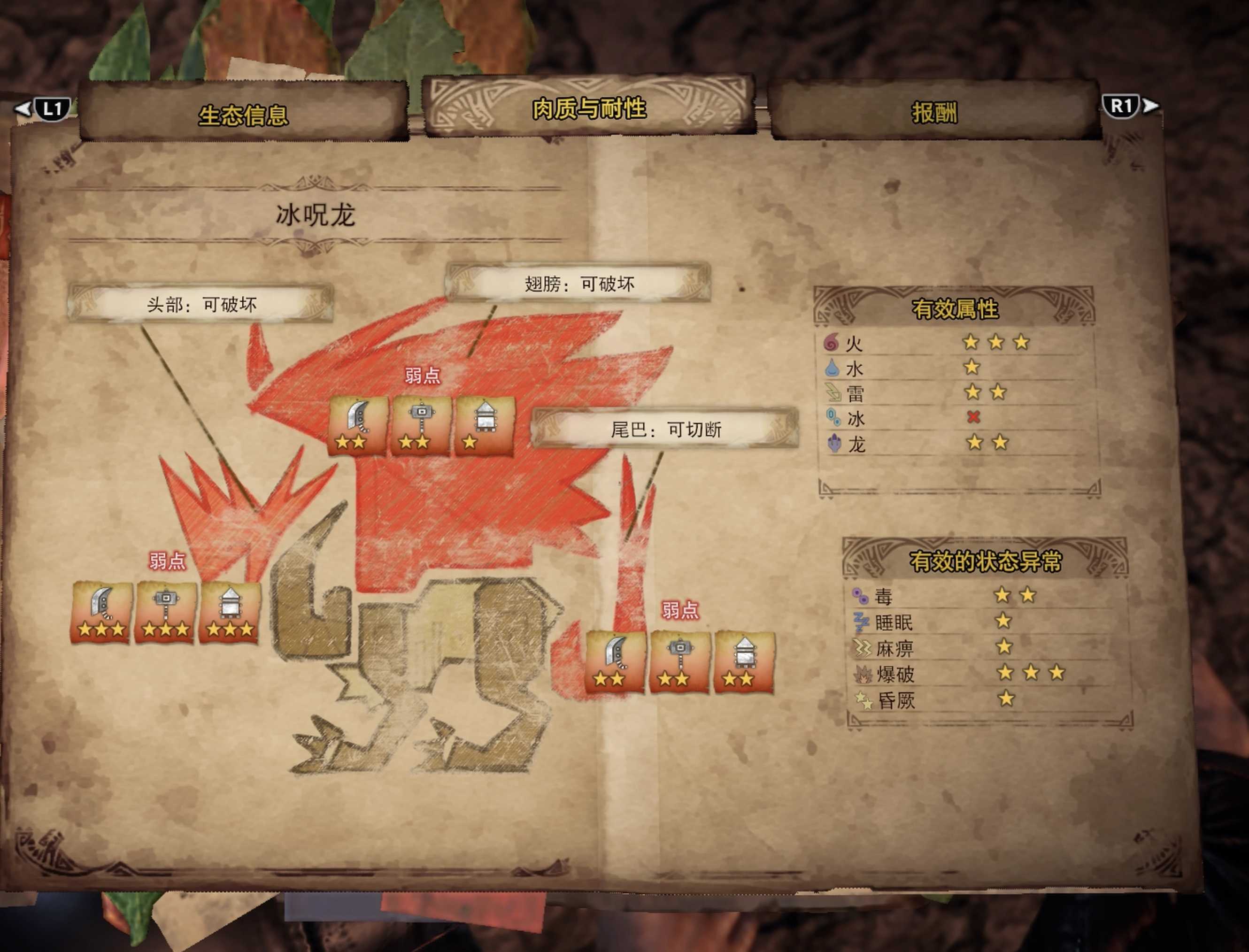 ● 部分怪物个别部位破坏后,肉质和属性吸收会上升;