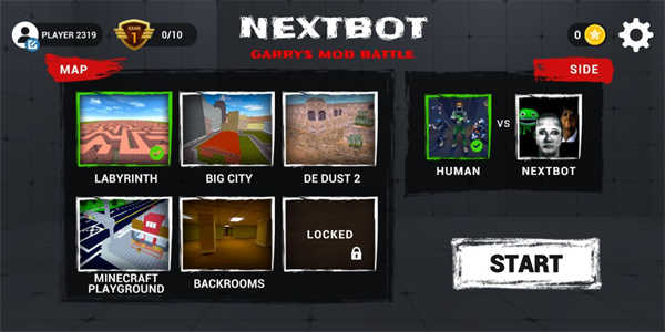 1、首先进入nextbots密室射手游戏,点击start开始游戏;