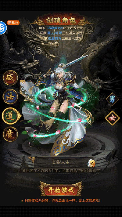 1、点击运行游戏后,在标题界面选择好职业、名字性别后就可以找到并点击“开始游戏”的功能选项进行冒险了;