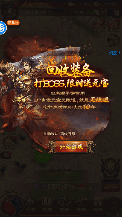 战神霸业3职业传奇是一款超变态传奇手游,上线即可领取丰厚的奖励,如万元真充卡,全系列的至尊雷霆套装,帮助玩家快速渡过新手期,作为一款传奇手游,战神霸业还原了传奇游戏的经典特色,并创新的加入了变身系统以及跨服玩法,让战斗变得更具策略性、自由性。你可以轻松跨服PK决斗,开启血腥盛宴,随时随地展现实力。最好的装备等着你,各种精美礼品等着你,强大副本等着你挑战。号召你的兄弟们踏入玛法大陆,开始你的新冒险。