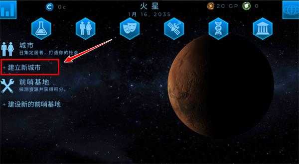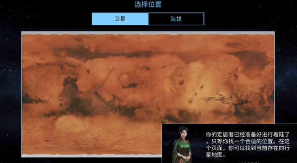 1、开局给你一颗火星,选择位置建造城市吧,从卫星云图中为我们的定居者找个家!