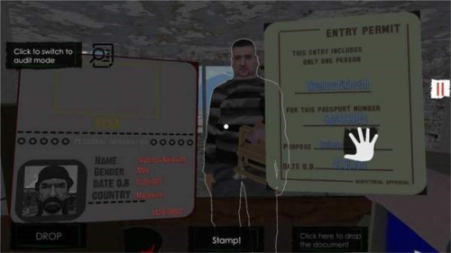 游戏内,在检查完护照和签证之后,一只手按住红色的拳头,另一只手拖动屏幕到那个人身上,就可以把签证和护照直接递交给游客了。