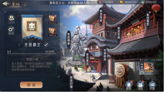 ★ 军团24级开启,加入军团后每2小时会刷新一个免费的军团礼包,购买后会给全军团的成员发放奖励,除免费礼包外购买其他礼包每天有次数限制,档位在每日0点刷新。在军团援助中可以发起求援,求援的道具由主角等级进行开放,在援助满时可获得双倍奖励若援助未满则可在第二天领取对应奖励。