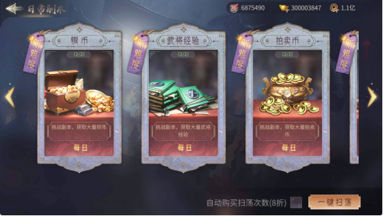 ★ 每日开放的日常副本有铜币、武将经验、拍卖币,副本的难度关卡的开启由战力决定,战力越高开放的关卡就越高,同时获得的奖励也越丰富,挑战副本不消耗次数,不过挑战完成后的关卡扫荡需要消耗次数每天每种副本有两次扫荡次数,建议在所有提升都完成后再进行扫荡以获取最大收益。
