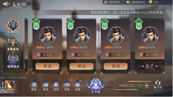 ★ 竞技场每日可免费挑战5次,消耗100元宝可购买5次次数,每日奖励根据挑战次数领取奖励,挑战10次时能获取一个价值250元宝的高级招募令,挑战时也会获得竞技币,建议每日都挑战满10次领取所有奖励同时提升历史最高排名可获得元宝奖励,前期竞技场的敌人大多数为人机,可以尽快的挑战更高的名次来获取更多奖励。