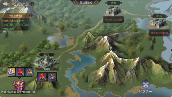 ★ 北定中原模式可获取大量的装备材料,没有挑战次数限制,通过指定的关卡后还可获得额外奖励,不仅通关可以获得奖励,通过巡逻宝箱的功能挂机也能获得大量收益,挂机的收益和通过的关卡数挂钩,要想获得更多奖励,可以尝试在打不过的关卡多挑战几次,依靠暴击或闪避通关。