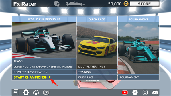 1、进入真实方程式赛车模拟游戏,选择世界锦标赛,快速比赛以及锦标赛等模式,新手建议选择第一个模式,点击“START CHAMPIOINSHIP”。