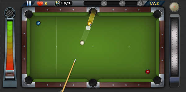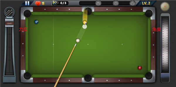 3、游戏玩法完美还原台球玩法,左边为力气操作、右边为角度操作;