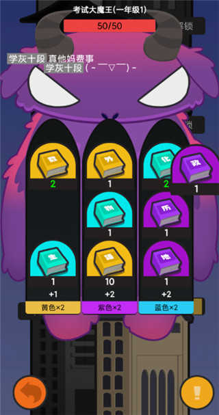 游戏规则:三个子弹为一列,如果一列中同种颜色的子弹多的话,攻击次数和攻击力都会提高的,看技巧打boss。但只有一次操作机会,点击拖动一门学科,可以与另一门学科交换位置,提升杀伤力。
