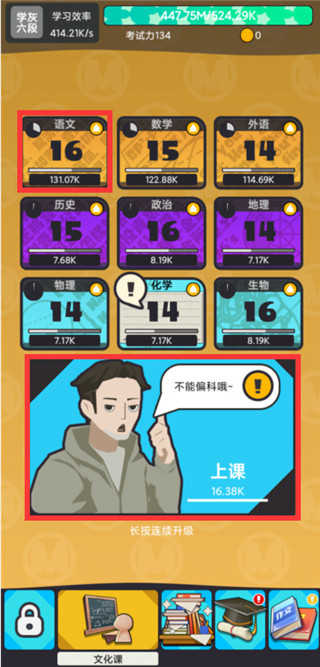 知识点溢出怎么办?简单,那就是消耗!点击左下角‘文化课’选择一个九大学科,然后点上课升级!