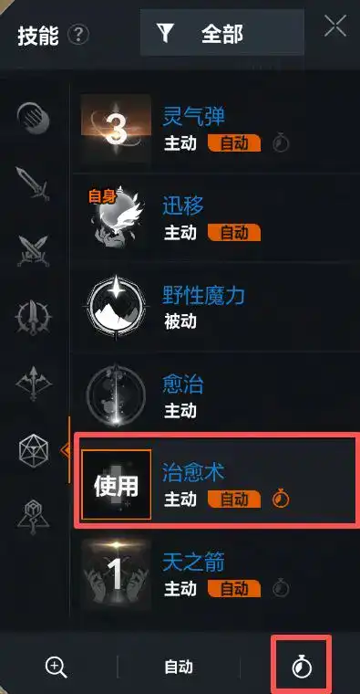 如果想要自己设置技能使用频率,可以在技能页中,选择主动技能,然后在右下方点击小怀表图案。