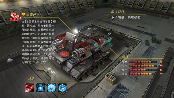 由【S国鄂木斯克科学部】研发,因冷战,军方争议等一再延迟配装。磁暴坦克对战场的破坏性,对战争的颠覆都达到了前所未有的高度,"磁聚能炮"的威力震慑全球。坦克英雄特斯拉就率领磁暴坦克部队多次挽救帝国濒临崩溃的战局,受到帝国军的多次嘉奖,磁暴坦克成为S军的"功勋坦克"。