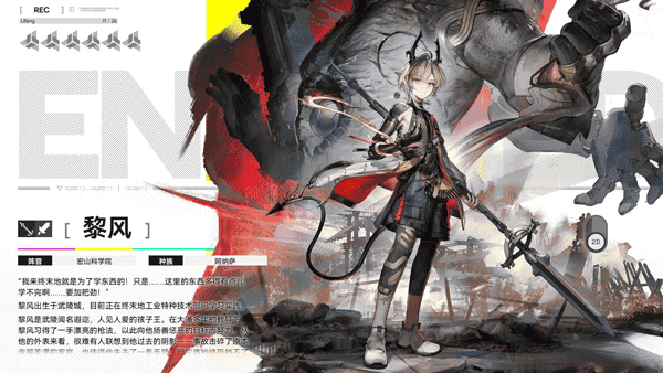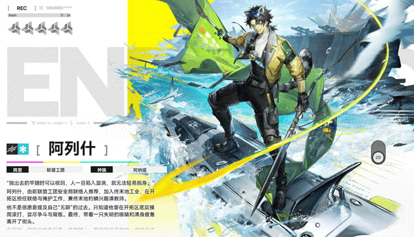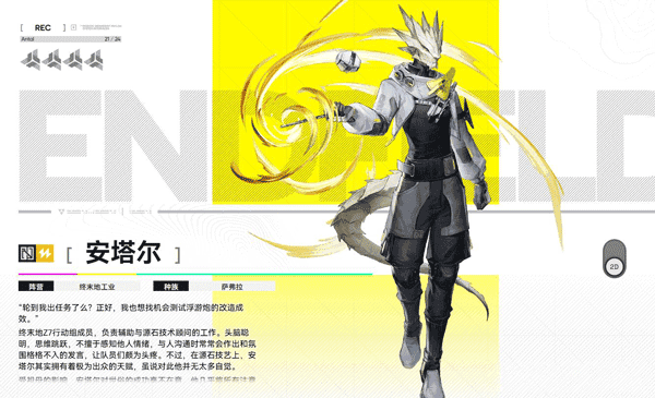 终末地工业的监督员和官方发言人,负责监督各地是否存在安全隐患并上报,需要经常走访各地。近战定位,用佩剑发动范围攻击,被动技能能叠加伤害,前期清图特别强力。