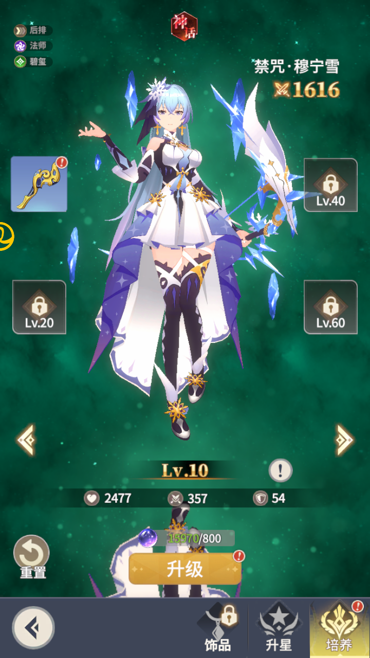 冰晶刹弓:穆宁雪激活体内的寒冰能量,唤出冰晶刹弓攻击敌方,对敌方全体造成寒冰伤害,并让全场进入极寒风暴之中。极寒风暴每秒对敌方造成寒冰伤害,并且穆宁雪在极寒风暴中,提升暴击率,并且普通攻击替换为极寒冰箭。