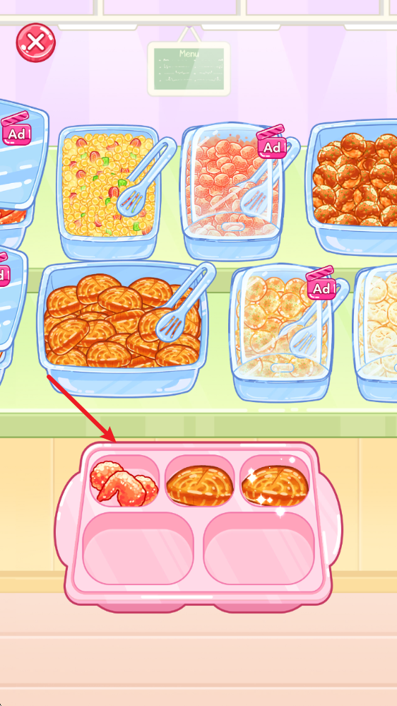 3、选择心仪的食物后即可放到餐盘中,这样的小格可以用来放各种菜品。