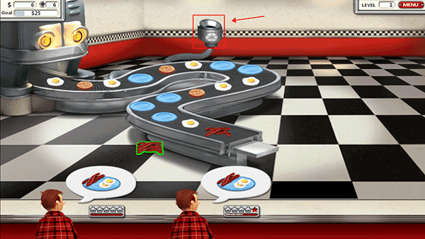 3、根据客人的需求,依次点击汉堡的制作食材即可进行制作,先点击盘子再点击培根、鸡蛋,做好后点击顾客的气泡就可以了。