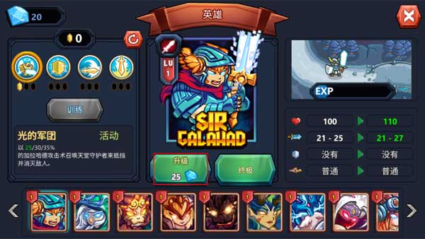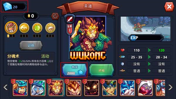 游戏中英雄可使用钻石进行提示等级和终极形态,而且随着等级的提升,还能通过训练增加其技能的强度!