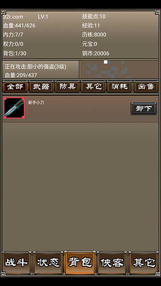 4、在【背包】页面,玩家可以看到自身的装备情况,具体的分类菜单还有全部、武器、防具、其它、消耗、出售。