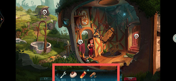 1、点击神奇的豆茎,得知需要魔法豆子、蓬松的云和长笛,点击右侧大树,得知需要青蛙,点击女孩旁边的小红花,得知需要森林仙子