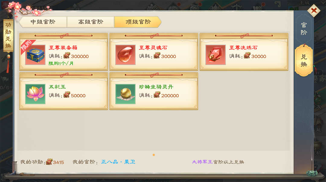 5、功勋商店不同职位官阶可以兑换不同属性的灵药,官阶越高,兑换的灵药属性更高。消耗功勋值兑换后,若不足当前官职,则会进行官阶降级。