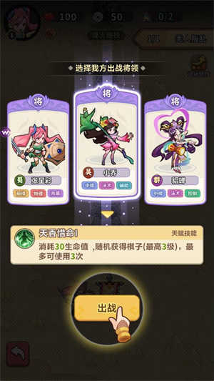 2、进入关卡后需要先选择一位初始将领,然后将武将放在棋盘上点击战斗按钮开始闯关。