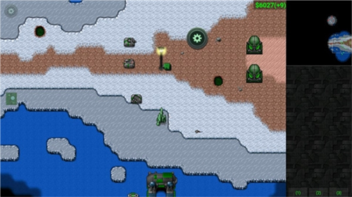 游戏开始时,玩家会拥有一个指挥中心和一个建造者单位。指挥中心可以生产建造者和用于侦查的侦查单位,建造者则负责建造各种建筑。陆军工厂、海军基地、空军基地和机甲工厂这四种建筑可以生产不同类型的作战单位。为了维持单位生产,你需要在地图上的绿色资源池区域建造资源采集器来获取必要资源。