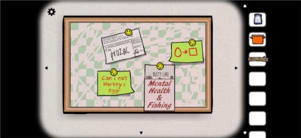 、百忧解10毫克(一种精神药物”、精神健康钓鱼中心的传单,用哈维之蛋换取方块的提示。