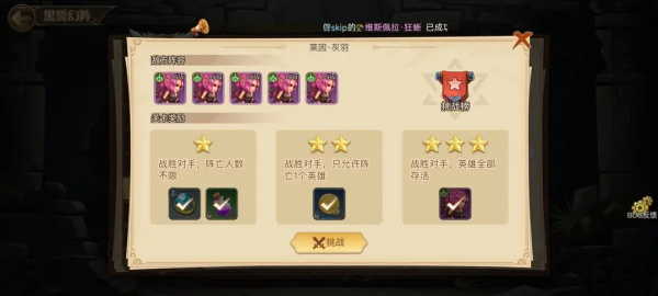 PS:这里说一下自己过星级挑战的技巧:一、尽量手动操作。二、在遇到较难的关卡挑战时,先把加成食物吃上(通过生活技能可以获得)。三、遇到全射手关卡先卡射手身位。(射手被近身后会削弱攻击,除特定天赋英雄)