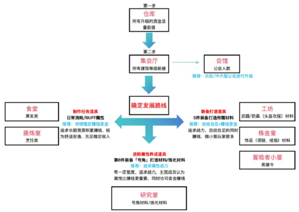 第一步:要升级任何建筑,先升金库,金库有容量了,才能存下更多的公会资金来升级其他建筑。